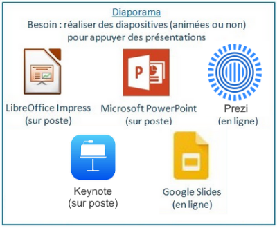 Le diaporama peut donc être réalisé à l'aide d'un logiciel de présentation assistée par ordinateur, installé sur le poste de travail : on dit que c'est une application locale (comme Libre Office Impress ou Powerpoint)